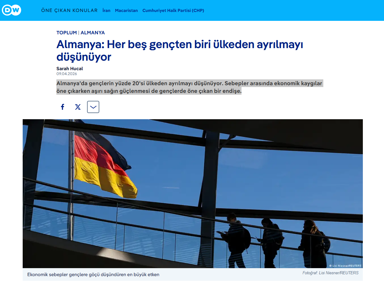 Avrupa; CHP ve beslemesi trollerin gazıyla hayal kuranların hevesini kursağında bırakmaya devam ediyor. Alman yayın kuruluşu Deutsche Welle (DW), ülkenin düştüğü durumu "Almanya'da gençlerin yüzde 20'si ülkeden ayrılmayı düşünüyor. Sebepler arasında ekonomik kaygılar öne çıkarken aşırı sağın güçlenmesi de gençlerde öne çıkan bir endişe." ifadeleriyle itiraf etti.