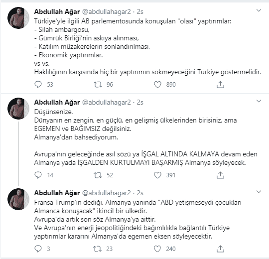 Avrupa'da artık son sözün Almanya’ya ait olduğunu ifade eden Ağar, ‘Avrupa'nın enerji jeopolitiğindeki bağımlılıkla bağlantılı Türkiye yaptırımlar kararını Almanya'da egemen eksen söyleyecektir’ ifadelerine yer verdi.