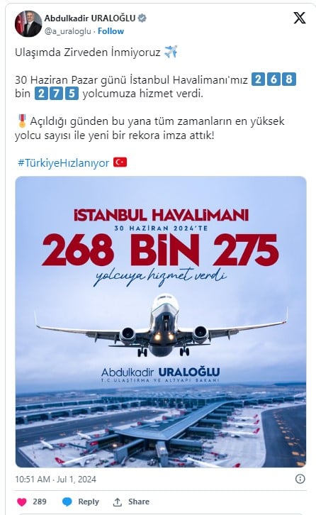 30 Haziran’da yolcu rekoru kırıldığını duyuran Ulaştırma ve Altyapı Bakanı Abdulkadir Uraloğlu, bu yolcuların 205 bin 721’ini dış hatlar, 62 bin 554’ünün ise iç hatlar yolcularının oluşturduğunu açıkladı. İstanbul Havalimanı’nda günlük yolcu sayısında önceki rekor 265 bin 961 yolcu ile 2 Temmuz 2023 tarihine ait.