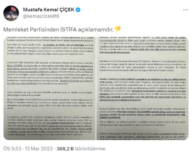 Memleket Partisi eski Genel Disiplin Kurulu Başkanı ve Muharrem İnce'nin avukatı Mustafa Kemal Çiçek, partisinden istifa ettiğini zehir zemberek sözlerle duyurdu. Deprem bölgesinde sela okunmasını eleştiren Muharrem İnce'nin açıklamalarına göndermede bulunan Çiçek, "Acıda dahi birliktelik sergilemekten uzak hale getirilmiş bir yapılanmada bulunmanın ve çabalamanın gereksiz olduğuna inanıyorum" ifadelerini kullandı.
