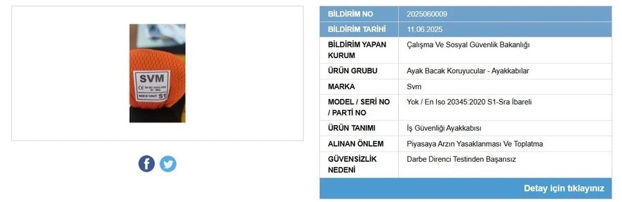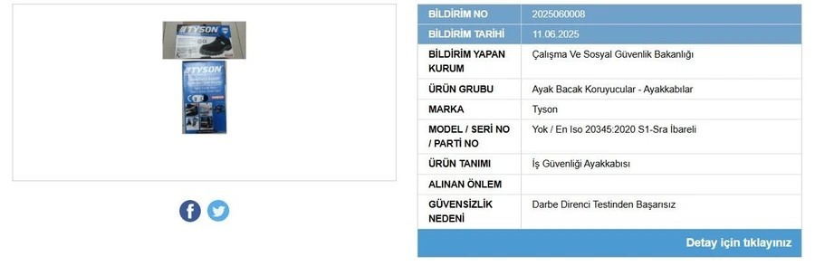 Yaralanma riski taşıyan ürün, 11 Haziran 2025 tarihli bildirimle birlikte Güvensiz Ürün Bilgi Sistemi (GÜBİS) listesine dahil edildi. “Ayak Bacak Koruyucular - Ayakkabılar” kategorisinde yer alan ürünün piyasaya arzı yasaklandı ve toplatılmasına karar verildi.