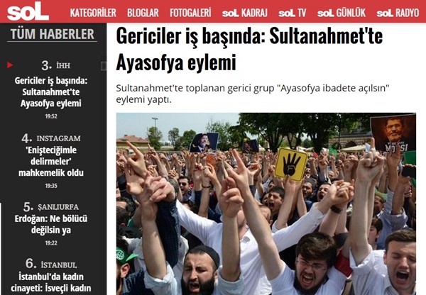 Sol, büyük katılımın olduğu gözlenen yürüyüşü, "Sultanahmet'te toplanan gerici grup 'Ayasofya ibadete açılsın' eylemi yaptı" ifadeleriyle haberleştirdi.