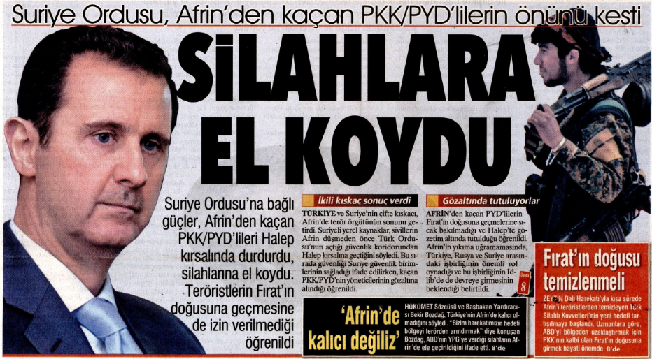 Geçtiğimiz aylarda, Reuters’ın gündeme getirdiği bir haber, Esed ile terör örgütlerinin bağını açıkça ortaya koymuştu. Esed rejiminin ileri gelen komutanlarından biri, ismini gizleyerek Reuters’a konuşmuş ve teröristlere yardım ettiklerini doğrulamıştı. YPG’nin kendileriyle ittifaktan başka bir seçeneği olmadığını ifade eden komutan, teröristlerin kendi toprakları üzerinden Afrin’e geçişine ses çıkarmadıklarını da belirtmişti. Ayrıca Afrin'in TSK ve ÖSO'nun eline geçmesinin ardından bir mühimmat deposuna yapılan baskında da çok sayıda ABD, Alman, Rus ve NATO silahlarının yanısıra Şam rejimine ait silahlar ele geçirildi. Aydınlık ise Şam şeytanının bu desteklerini görmezden geldi...