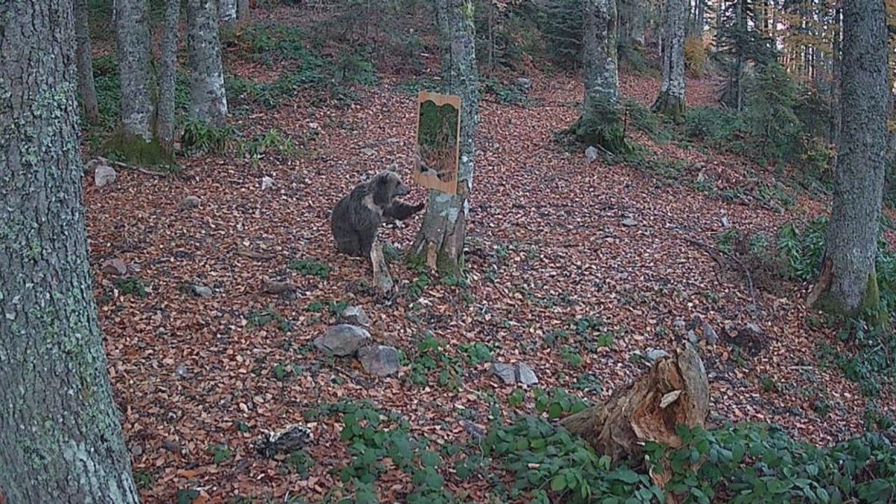 Ormanda aynada kendini gören ayının hareketleri fotokapana yansıdı. Sosyal medyada paylaşılan görüntüler gülümsetti.