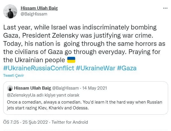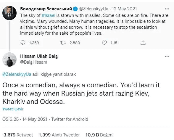 Hissam Ullah Baig adlı Filistinli bir kullanıcı ise bu tweete "Bir komedyen daima komedyendir. Bir gün Rus uçakları Kiev, Kharkiv ve Odessa'yı bombaladığında anlarsın." yanıtını verdi.