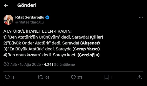 Rifat Serdaroğlu, hızını alamayarak yaptığı başka bir paylaşımda ise, “Atatürk’e ihanet eden 4 kadın!” başlığıyla, başta kendisini Sağlık Bakanı olarak görevlendirilen eski Başbakan Tansu Çiller olmak üzere dört isim saydı. İşte saydığı o isimler: