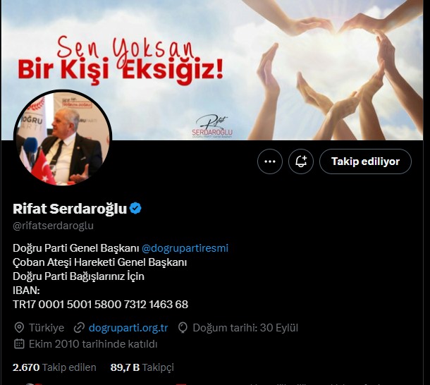 Partisine bağış için IBAN numarasını profiline sabitleyen Doğru Parti isimli tabela partisinin Genel Başkanı Rifat Serdaroğlu, Özlem Çerçioğlu’nun AK Parti’ye geçişine ilişkin çirkin paylaşımlarıyla dikkat çekti.
