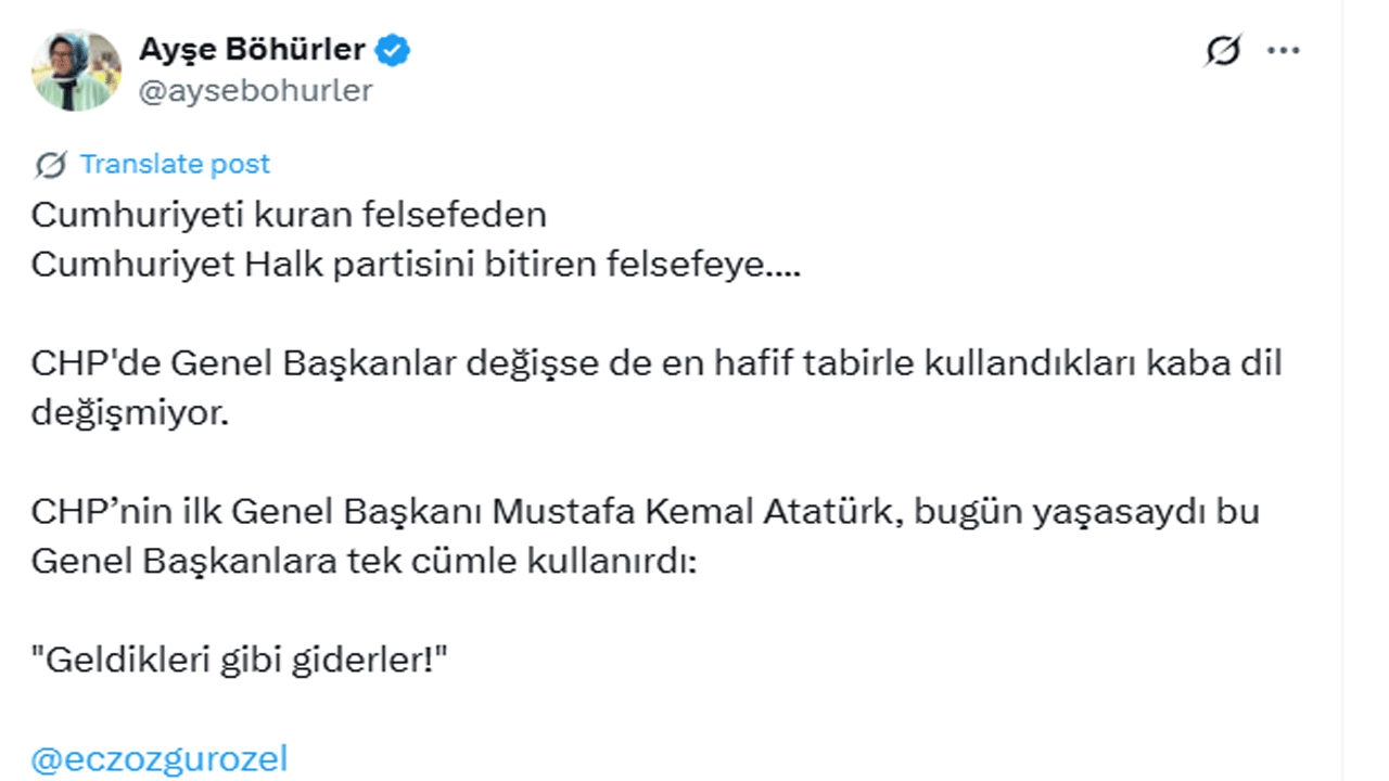 Böhürler, X platformundaki hesabından yaptığı paylaşımda şu ifadeleri kullandı. “Cumhuriyeti kuran felsefeden Cumhuriyet Halk partisini bitiren felsefeye.... CHP'de Genel Başkanlar değişse de en hafif tabirle kullandıkları kaba dil değişmiyor. CHP’nin ilk Genel Başkanı Mustafa Kemal Atatürk, bugün yaşasaydı bu Genel Başkanlara tek cümle kullanırdı: "Geldikleri gibi giderler!"