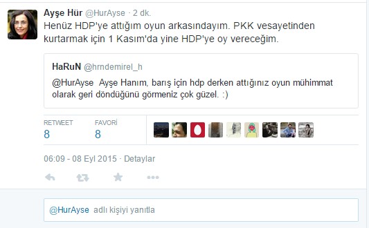 Doğan Medyası'na ait Radikal'de köşe yazarlığı yapan Ayşe Hür, sosyal medyadan 'HDP'ye attığım oyun arkasındayım. 1 Kasım'da yine HDP'ye vereceğim' diyerek skandal bir açıklama yaptı.