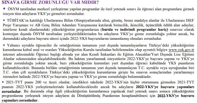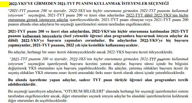 2021-TYT puanı 200 ve üzeri olanlar, istedikleri takdirde 2022-YKS’nin hiçbir oturumuna girmeden 2021-TYT puanını 2022-YKS yerleştirmelerinde kullanabileceklerdir ancak bu adayların 2022-YKS’ye başvuru yapmaları zorunludur. Bu durumda olup ilgili yükseköğretim kurumlarınca yapılacak özel yetenek sınavı sonucu yükseköğretim programlarına yerleşmek isteyen adayların da Dönüştürülmüş Puanlarının hesaplanabilmesi için 2022-YKS’ye başvuru yapmaları zorunludur. 2022-YKS’de SAY, SÖZ, EA veya DİL puanıyla bir programa yerleşmek isteyenlerin (2021- TYT puanı 200 ve üzeri olsa bile) 2022-AYT ve/veya 2022-YDT oturumlarına başvuru yaparak katılmaları zorunludur.