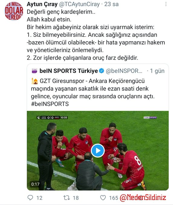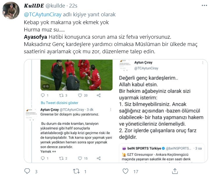 GZT Giresunspor - Ankara Keçiörengücü maçında hurma, muz ve su ile oruçlarını açan futbolcuları eleştiren İYİ Partili Çıray, akıl vermeye çalıştı. Çıray'ın maç saatlerinin ayarlanması önerisi yerine oruç tutan futbolcuları eleştirmesi dikkat çekti. Öte yandan Aytun Çıray'ın daha önce "Zor işlerde çalışanlara oruç farz değildir" tweetini attığı ve tepki gelince paylaşımını kaldırdığı belirlendi.