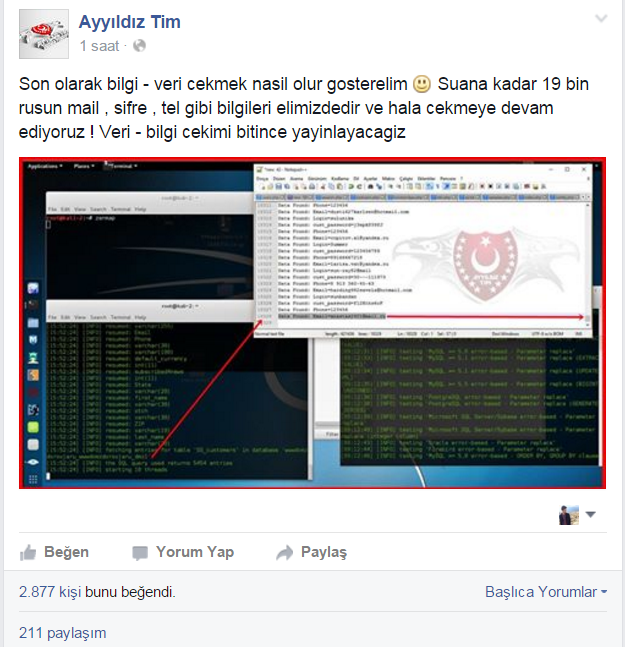 Rus hacker'ların son günlerdeki saldırılarına karşılık cevap veren Türk Hacker Ekibi Ayyıldız Tim'den Ruslara cevap verdi. 19 bin Rusun bilgilerini ele geçirdiklerini söyleyen Ayyıldız Tim, Rus Ekonomi Bakanlığı sitesine de darbe yaptı.