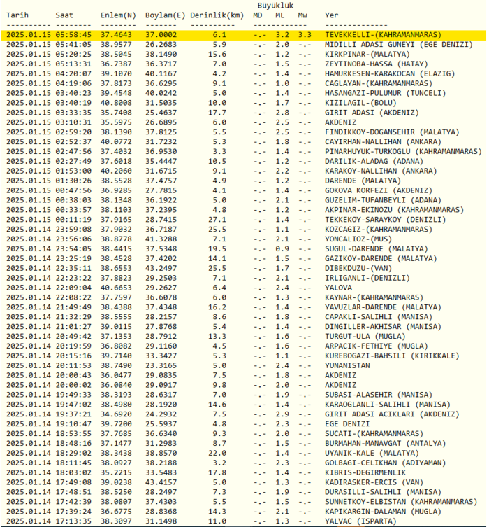 Deprem 15 Ocak Çarşamba | Deprem riski ile her an karşı karşıya olan fay hatları üzerindeki ülkemizde, sarsıntıların şiddeti, olduğu yer gibi teknik bilgiler iki farklı kaynak tarafından paylaşılıyor. Yeni gelişme var mı? AFAD ve Kandilli Rasathanesi'nin hesaplamalarıyla vatandaşlar, ülkede olan depremleri, şiddetini ve artçıları anlık olarak öğrenebilirken 15 Ocak 2025 AFAD, Kandilli Rasathanesi son depremler listesini sizler için derledik.