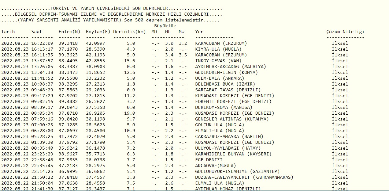 23 Ağustos 2022 Salı günü meydana gelen son depremler Kandilli Rasathanesi ile AFAD son depremler listesi içerisinde paylaşıldı