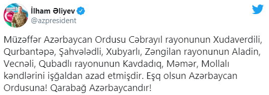 Sosyal medya hesabından açıklama yapan Azerbaycan Cumhurbaşkanı İlham Aliyev, 9 köyün daha Ermenistan işgalinden kurtarıldığını duyurdu.