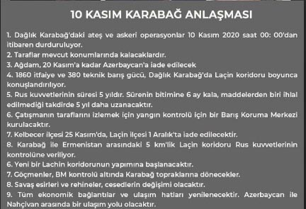 Anlaşmaya göre Azerbaycan ve Ermenistan kontrol ettikleri pozisyonlarda kalacak, Ermenistan, işgal altında tuttuğu Laçın, Kelbecer ve Ağdam illerini ay sonuna kadar boşaltacak. Bölgeye Rus barış güçleri konuşlandırılmasını öngören anlaşma kapsamında Rus ve Türk askerlerden oluşan denetim merkezi de oluşturulacak.