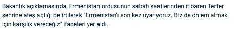 Azerbaycan Savunma Bakanlığı, sivil yerleşim birimlerine ateş açmaya devam eden Ermenistan ordusunu son kez uyardı.