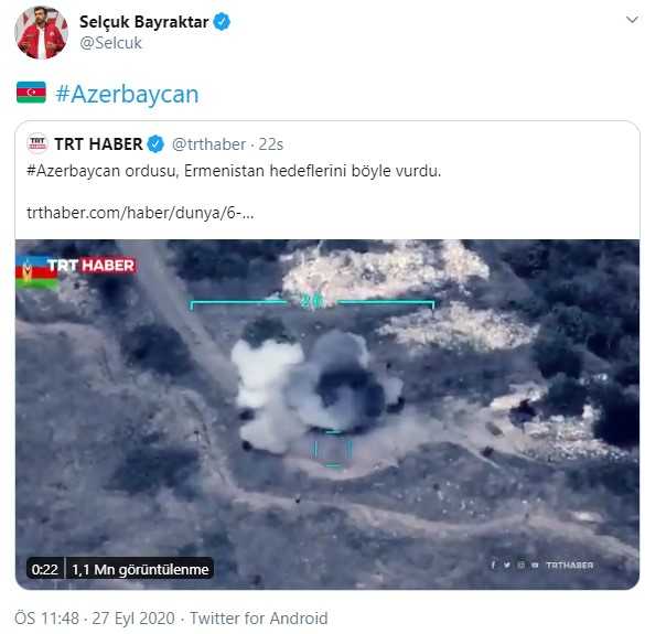 Azerbaycan'ın Ermenistan hedeflerini imha etmesi sonrası Baykar Teknik Müdürü ve T3 Vakfı Mütevelli Heyeti Başkanı Selçuk Bayraktar, sosyal medya hesabından SİHA'ların vurduğu görüntüleri paylaştı. Bayraktar'ın paylaşımı, Azerbaycan'ın Ermenistan'a karşı Türk SİHA'larını kullandığı yorumlarına yol açtı.