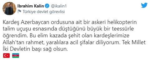 Cumhurbaşkanı Sözcüsü İbrahim Kalın da söz konusu kazada şehit düşen Azerbaycan askerleri için taziye dileklerini sosyal medya hesabı üzerinden yayımladı.