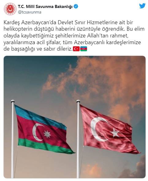 Milli Savunma Bakanlığı konuyla ilgili taziye mesajı yayımlandı. Yayımlanan mesajda şehid olan Azerbaycan askerleri için başsağlığı, yaralılar için ise acil şifalar dileklerinde bulunuldu.