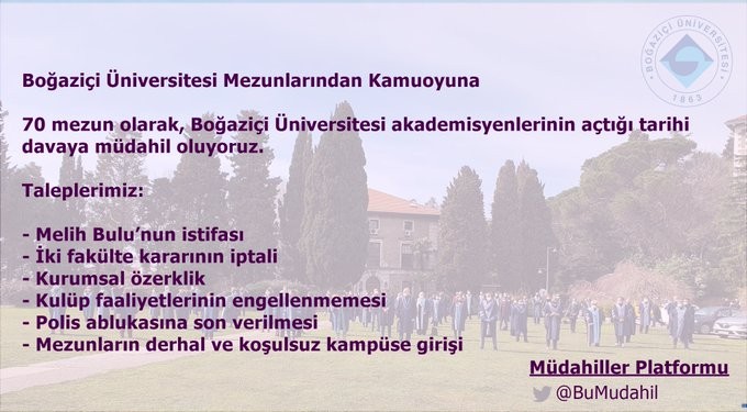 "BÜLGBTİ+ kulübü dahil, hiçbir öğrenci topluluğu faaliyetinin engellenmemesini, Cinsel Tacizi Önleme Komisyonu CİTÖK’e dokunulmamasını, Boğaziçi Üniversitesi'nin bir bileşeni olan biz mezunların üniversite yerleşkelerine girişlerindeki engellerin derhal ve koşulsuz kaldırılmasını, Din, dil, ırk, mezhep, etnik köken, fikir, cinsiyet kimliği, cinsel yönelim, yaş, her türlü engellilik ve diğer nedenlerle ayrımcılığa yer vermeden, herkese adil ve eşit davranılmasını istiyoruz."