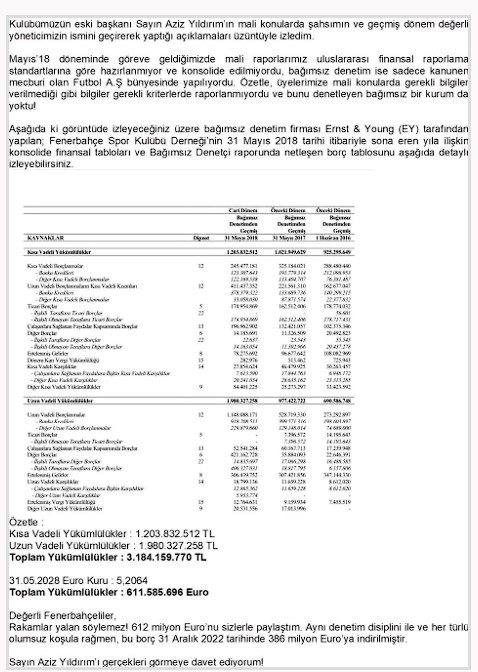 Değerli Fenerbahçeliler, Rakamlar yalan söylemez! 612 milyon Euro'yu sizlerle paylaştım. Aynı denetim disiplini ile ve her türlü olumsuz koşula rağmen, bu borç 31 Aralık 2022 tarihinde 386 milyon Euro'ya indirilmiştir."