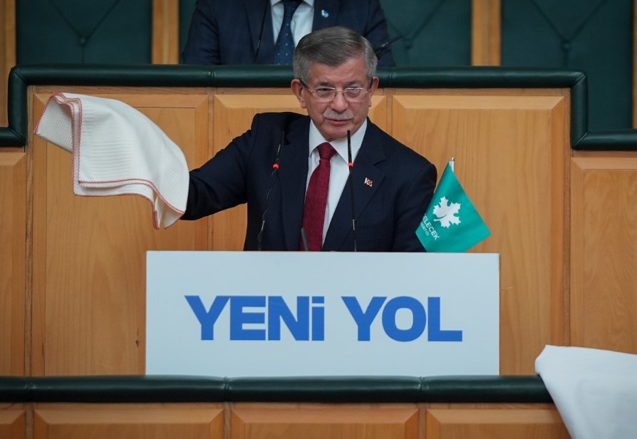 Gelecek Partisi Genel Başkanı Ahmet Davutoğlu, elinde beyaz bir kundak ve kefenle kürsüye çıktı.