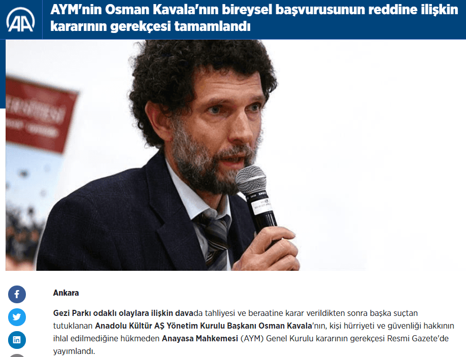 Anayasa Mahkemesi'nin Osman Kavala kararına ilişkin gerekçesi, 23 Mart 2021 tarihinde Resmi Gazete'de yayımlanmıştı