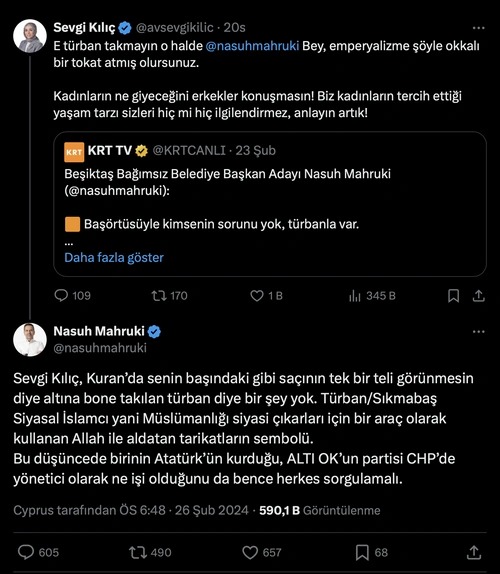 CHP’den Beşiktaş Belediye Başkan adayı gösterilmeyince intikam amacıyla bağımsız aday olan Nasuh Mahruki, katıldığı bir canlı yayında, "Türban, bir siyasal İslam ve emperyalizm sembolüdür. Başörtüsüyle kimsenin sorunu yok ama türbanla var" diyerek aklınca örtü üzerinden algı operasyonu yaptı.
