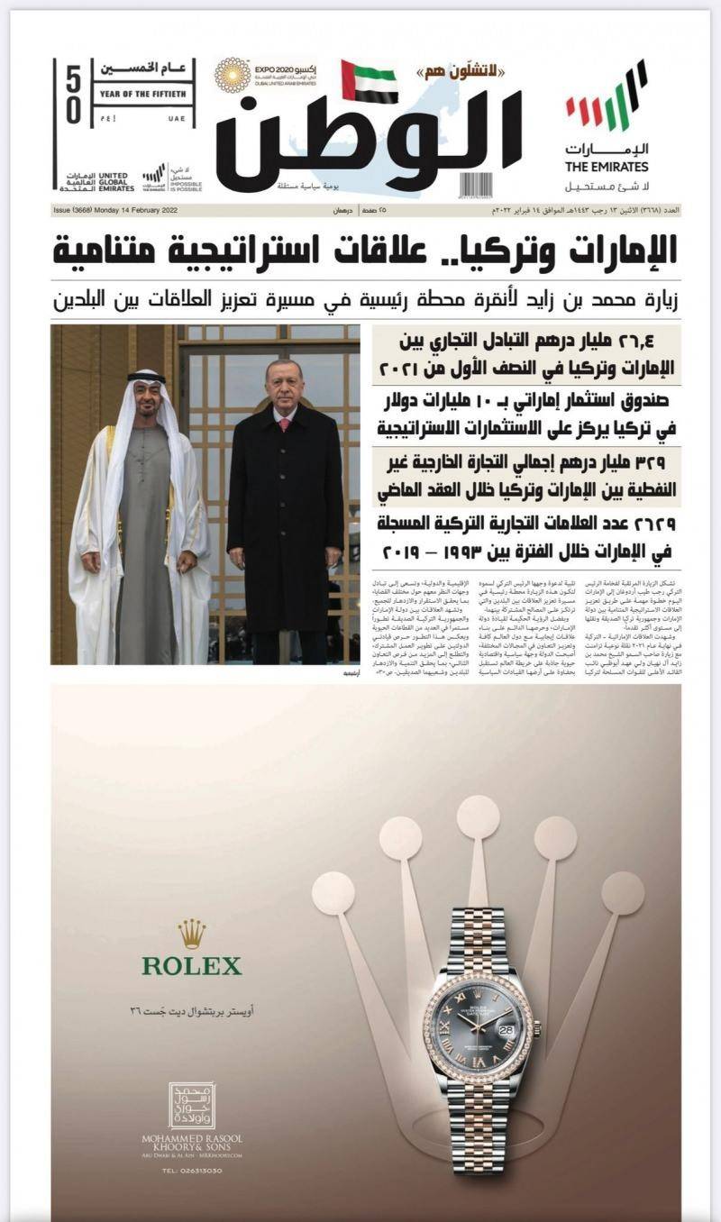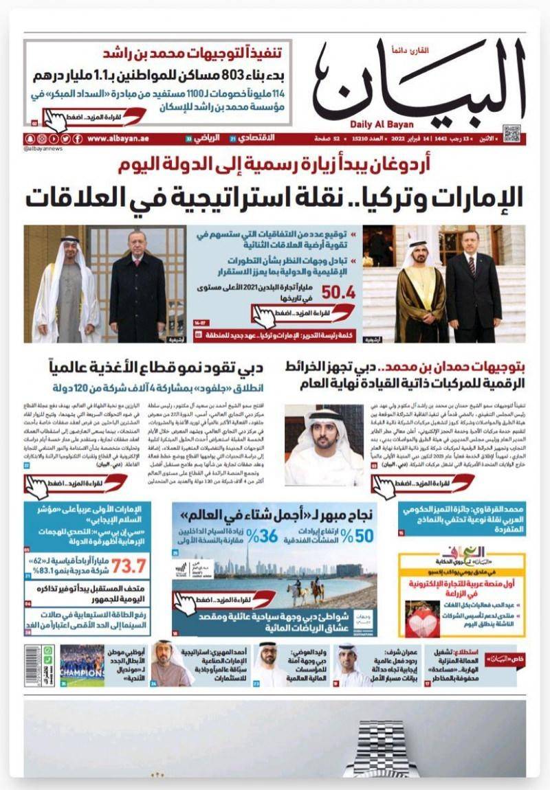 Cumhurbaşkanı Erdoğan'ın BAE ziyaretinin stratejik ilişkileri güçlendirme ve daha ileri bir düzeye taşıma yolunda önemli bir adım olduğunu vurgulayan gazete, Abu Dabi Veliaht Prensi Şeyh Muhammed bin Zayid Al Nahyan'ın Ankara ziyaretinin de Türkiye-BAE ilişkilerinin başta ekonomi olmak üzere birçok alanda gelişmesi açısından önemli bir başlangıç teşkil ettiğini belirtti.