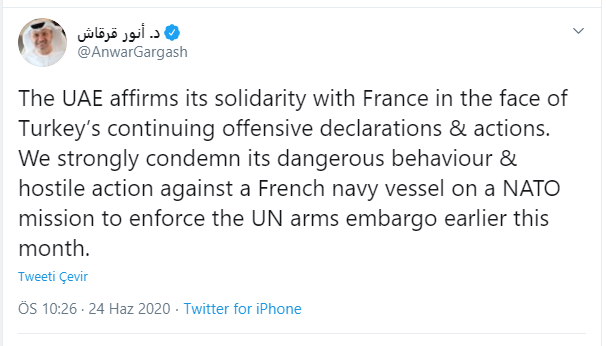 Darbeci Hafter'in en büyük destekçilerinden Birleşik Arap Emirlikleri'nin Dışişleri Bakanı, Türkiye'ye karşı Fransa ile dayanışma içinde olduğunu bildirdi.