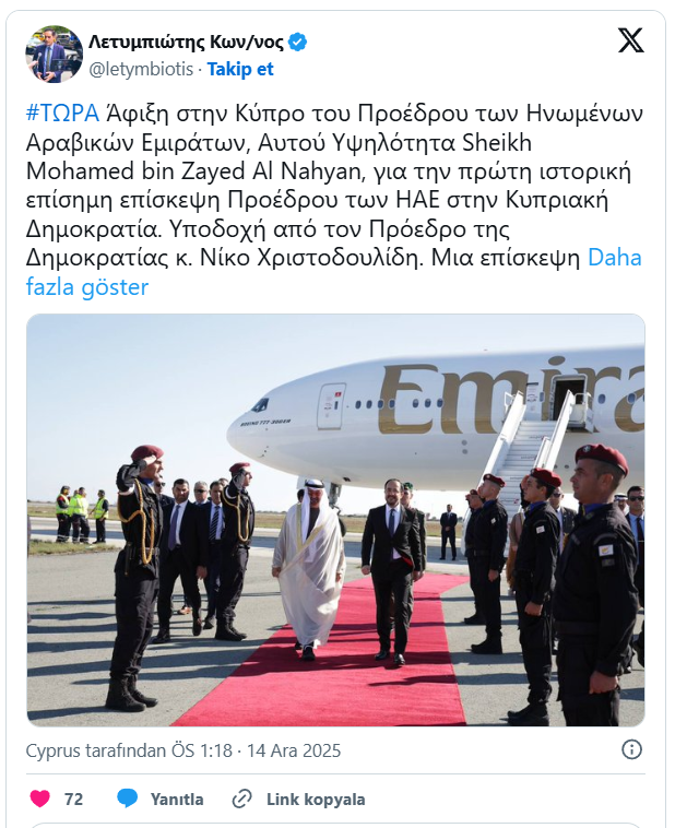 Rum yönetimiyle yapılan temaslarda savunma, enerji ve stratejik iş birliği başlıklarının öne çıkması, BAE’nin son dönemde Doğu Akdeniz’de izlediği tartışmalı politik çizgiyi bir kez daha gözler önüne serdi. Ziyaret kapsamında Rum liderliğiyle verilen samimi pozlar ise Ankara’da “dostluk söylemleriyle çelişen bir adım” olarak değerlendirildi.