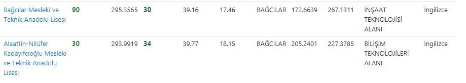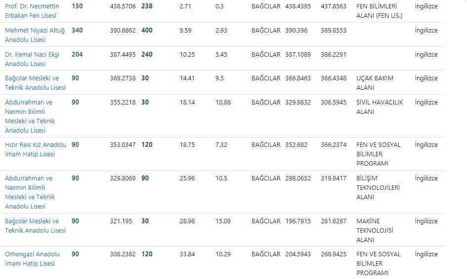 Bağcılar lise puanları yüzdelik dilimleri kontenjanları