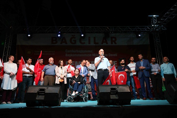 Programda ayrıca 15 Temmuz gecesi üniformalı darbeci hainlerin mermilerine, toplarına, tüfeklerine, tanklarına ve F16’larına göğüs geren ve yaralanan Bağcılarlı gaziler, hemşehrilerini selamladı. Onbinler, kahraman hemşehrilerini adeta bağırlarına bastı. Çağırıcı, ilerleyen anlarda ayrıca ülkemizde eğitim gören 116 ülkenin vatandaşı olan üniversite öğrencileriyle birlikte hemşehrilerini selamlarken birlikte Türk bayrağını dalgalandırdı.