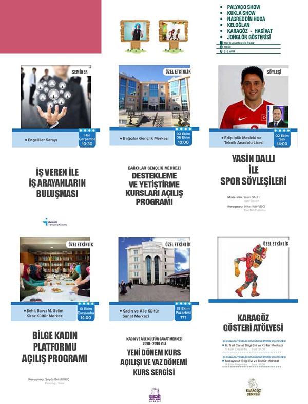 Ekim ayı içerisinde Şehit Savcı Mehmet Selim Kiraz Kültür Merkezi’nde sanatçı Eşref Ziya Terzi, söyleyeceği tasavvuf müziği ile davetlilere duygusal dakikalar yaşatacak. Ayrıca bilgi evleri ve kültür merkezlerinde Çocuk ve Yetişkin Sineması, Yetişkin Tiyatro Kursu, Çocuk Animasyonları düzenlenecek. Çocuklar için Tavşan Okulu ile Kurbağa Krallığı: Buz Macerası sinema filmleri ve Bana Bir Masal Anlat, Sihirli Lamba, Ormandaki Yaramaz gibi tiyatro oyunları: yetişkinler için ise Dağ 2 ve Ayla gibi filmlerinin gösterimi yapılacak.