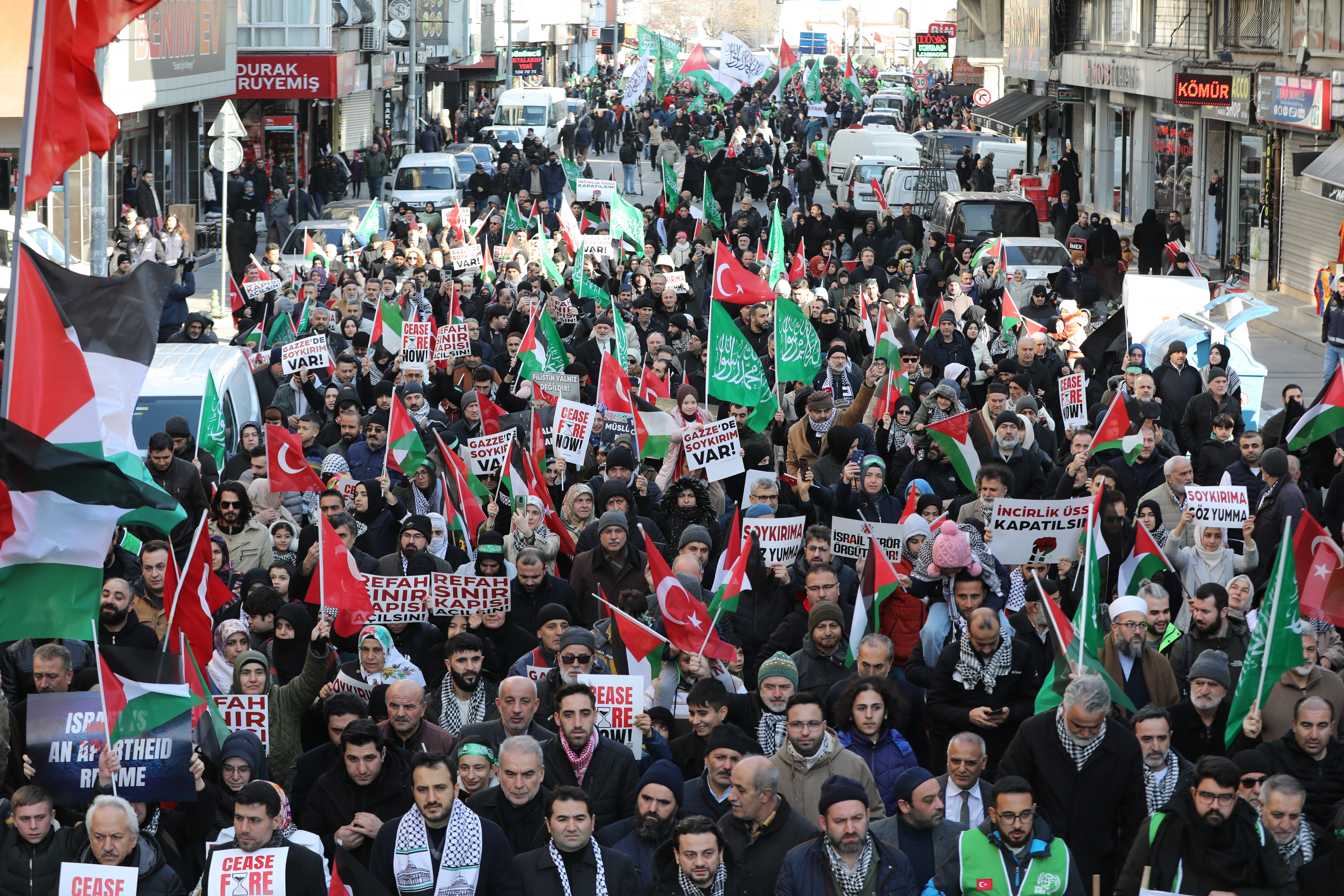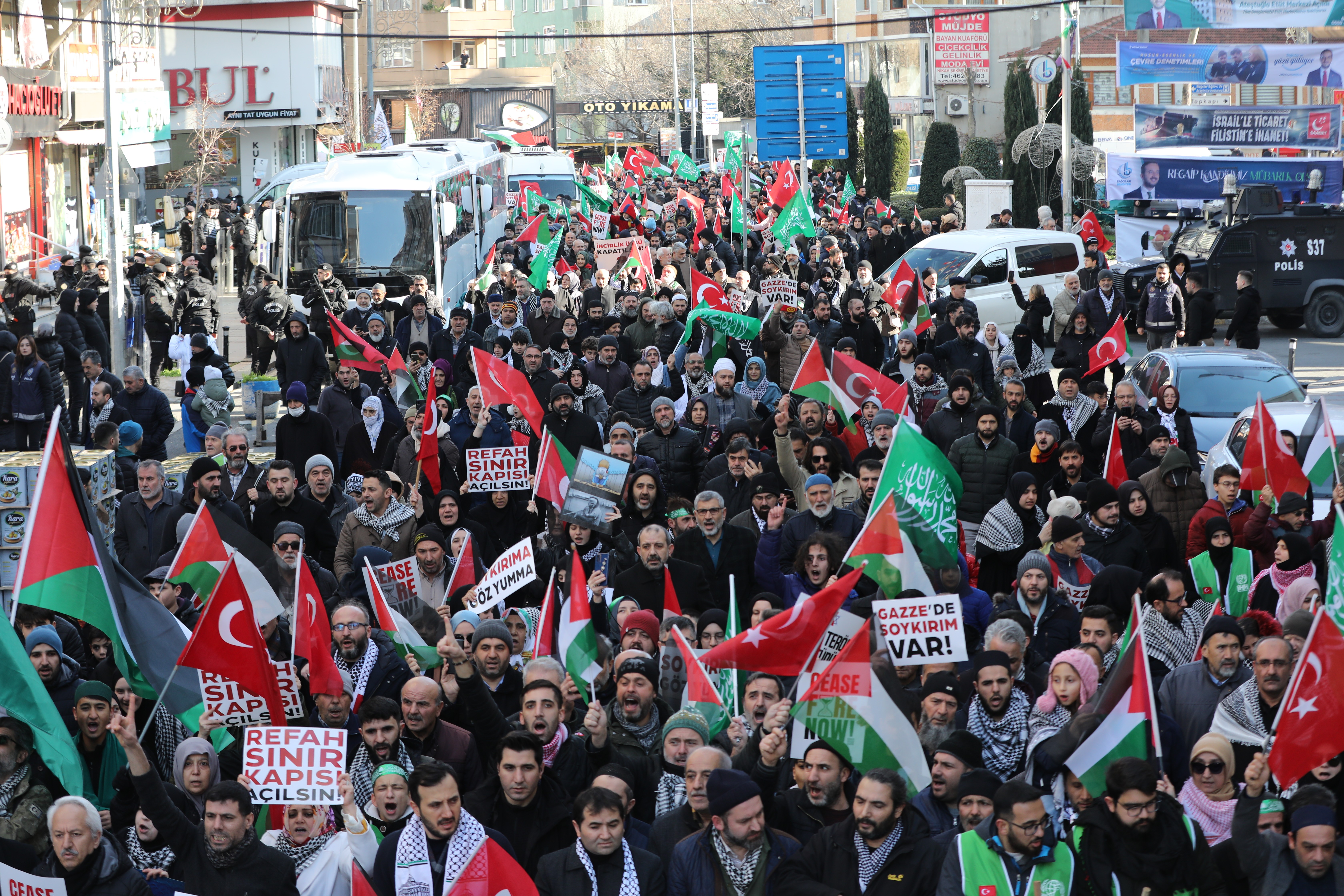 Yürüyüş boyunca, "Şehitler Ölmez Vatan Bölünmez, Katil İsrail Filistin'den Defol, Kahrolsun Amerikan Emperyalizmi" sloganları atıldı, tekbirler getirildi.