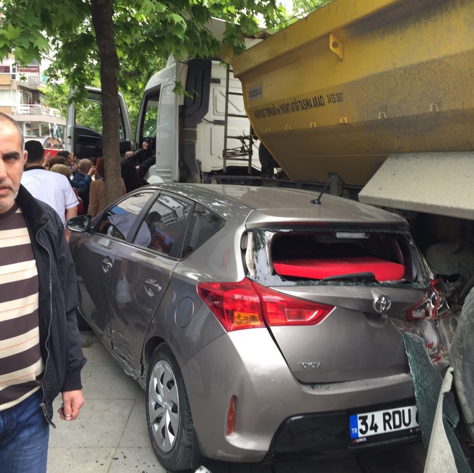 Hafriyat kamyonunun sürüklediği otomobilin sürücüsü Harun B., "Benim arabama vurdu. Duracak sandım ama sürükleye sürükleye buraya kadar getirdi. Arabada yalnızdım" dedi.