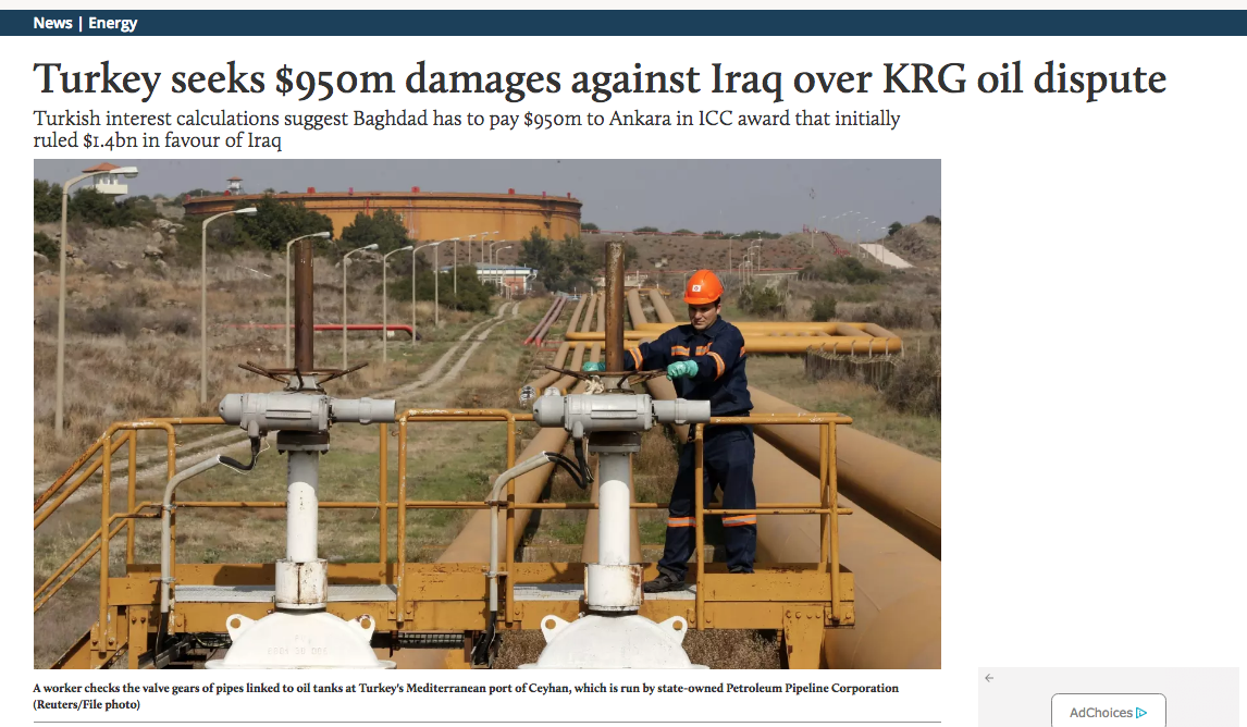 Geçtiğimiz Mart ayında Paris merkezli Uluslararası Tahkim Mahkemesi, Irak yönetiminin başvurusu üzerine Türkiye’yi Irak Kürt Bölgesel Yönetimi (IKBY) ile yaptığı petrol sevkiyatı anlaşmasından dolayı 1,4 milyar dolar tazminat cezasına çarptırdığı iddialarının aksine Türkiye’nin Bağdat’ın tüm alacakları çıkarıldığında 956 milyon dolar alacaklı olduğu belirtildi.