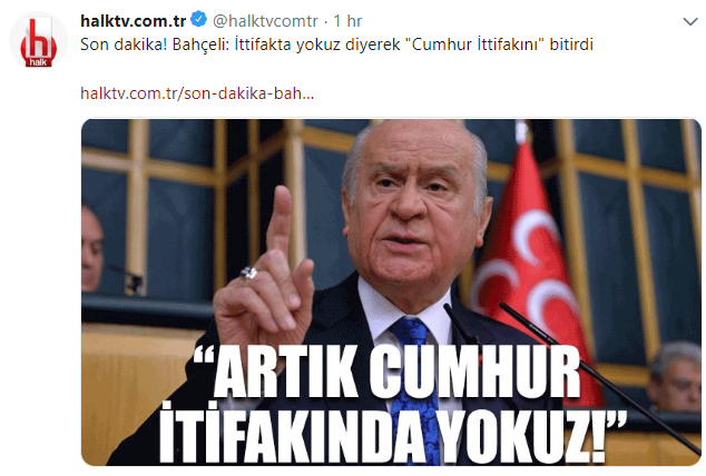 MHP Genel Başkanı Devlet Bahçeli, yerel seçimlerde ittifak olmayacağını açıkladı. Bazı CHP'li ve FETÖ'cüler, Bahçeli'nin açıklamasıyla Cumhur İttifakı'nın bittiğini sandı, sevinç naraları atmaya başladı. Bahçeli'nin Cumhur İttifakı açıklamasıyla hevesleri kursaklarında kaldı. Özellikle Halk TV, Bahçeli'nin ağzından, "Cumhur İttifakı bitti" dediği yalanını yazdı.