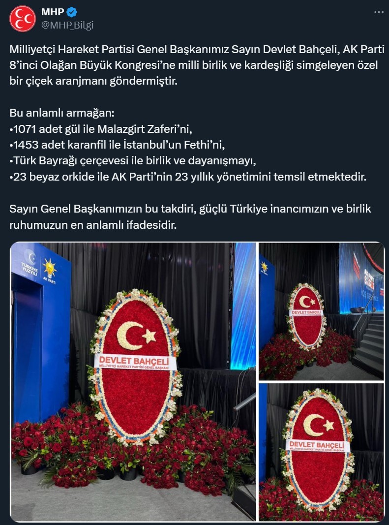 MHP lideri Devlet Bahçeli, AK Parti 8'inci Olağan Büyük Kongresi'ne milli birlik ve kardeşliği simgeleyen özel çiçek aranjmanı gönderdi.