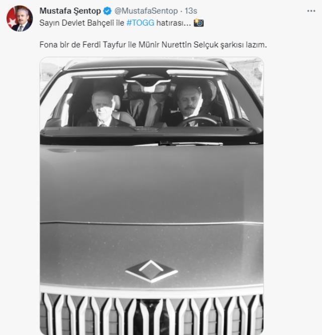Öte yandan Mustafa Şentop, sosyal medya hesabından kendisi ve Bahçeli'nin araçta olduğu fotoğrafın altına "Sayın Devlet Bahçeli ile #TOGG hatırası... Fona bir de Ferdi Tayfur ile Münir Nurettin Selçuk şarkısı lazım" notunu düştü.