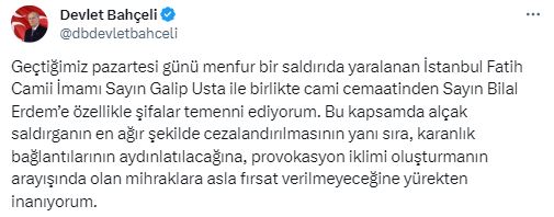 Bahçeli, sosyal medya hesabından yaptığı paylaşımda, pazartesi günü bıçaklı saldırıda yaralanan imam Galip Usta ile cami cemaatinden Bilal Erdem'e acil şifalar diledi.