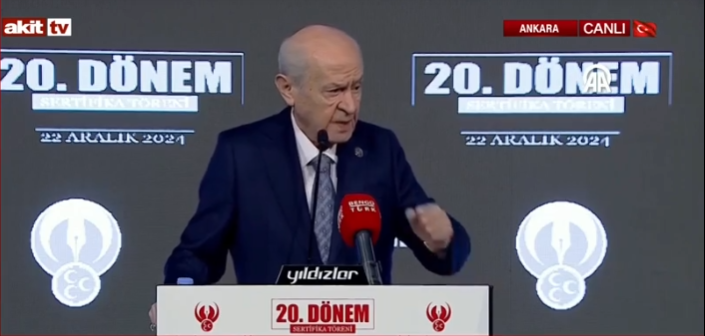 Siyaset ve Liderlik Okulu Sertifika Töreni'nde açıklamalarda bulunuyor... MHP lideri Bahçeli, konuşmasında "Türk milleti tarihi mirasıyla birleşti. Türkiye sahip olduğu güçle geleceğe kilitlenmiştir" ifadelerini kullandı. Cumhur İttifakı'nın sinsi kulislere kapalı olduğunu belirten MHP lideri Bahçeli "Türkiye'nin asıl gücü ve güvencesi Cumhur İttifakı'dır" dedi.