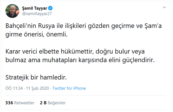 MHP Genel Başkanı Devlet Bahçeli’nin, “Türk milleti gerekirse artık başka bir seçenek de görülmezse Şam'a girmeyi şimdiden planlamalı ve zalimleri yerle yeksan etmelidir” sözlerinin ardından, AK Partili eski milletvekili Şamil Tayyar’dan dikkat çeken bir yorum geldi.