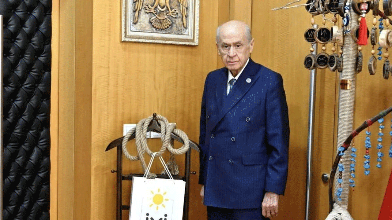 Toplantının ardından Bahçeli, urganı İyi Partiden istemiş ve odasına asıp poz vermişti.