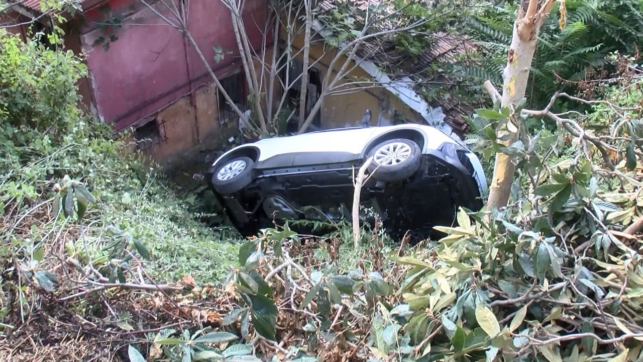 Sarıyer'de direksiyon hakimiyetini kaybeden 34 ASK 977 plakalı cip metrelerce yükseklikten bir evin bahçesine uçtu; sürücü yara almadan kurtuldu.