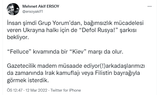 Habertürk yazarı Nagehan Alçı'nın Ukrayna askeri üniforması giyerek eski Cumhurbaşkanı Petro Poroşenko ile röportaj yapmasına tepki gösteren Habertürk TV sunucusu Mehmet Akif Ersoy, "Gazetecilik madem müsaade ediyor(!) arkadaşlarımızı zamanında da Irak kamuflajı veya Filistin bayrağıyla görmek isterdik." dedi. Ağır "üniforma" eleştirisinden sonra Habertürk yönetiminin Alçı'yı mı yoksa Ersoy'u mu göndereceği henüz bilinmiyor.