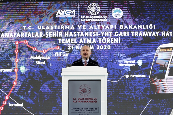 Ulaştırma ve Altyapı Bakanı Adil Karaismailoğlu, Anafartalar-Şehir Hastanesi-YHT Garı Tramvay Hattı Temel Atma Töreni'nde yaptığı konuşmada, binlerce yıllık medeniyeti, kültürü ve zenginlikleriyle Anadolu'nun kalbi olan Kayseri'de bulunmaktan büyük mutluluk duyduğunu söyledi.