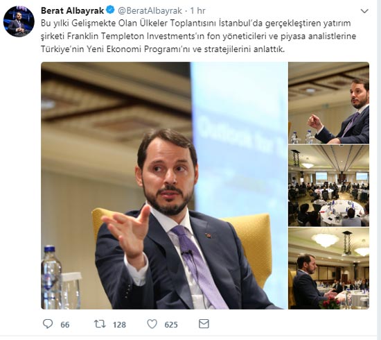 Hazine ve Maliye Bakanı Albayrak Twitter'da yaptığı açıklamada Gelişmekte Olan Ülkeler Toplantısı'na katıldığını duyurdu. Konuyla ilgili paylaşım yapan Bakan Albayrak toplantıda Türkiye'nin Yeni Ekonomi Programı'nı ve stratejilerini anlattığını ifade etti.