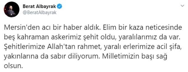 Hazine ve Maliye Bakanı Berat Albayrak, Mersin'de otobüs kazasında şehit olan 5 asker için taziyelerini iletti.